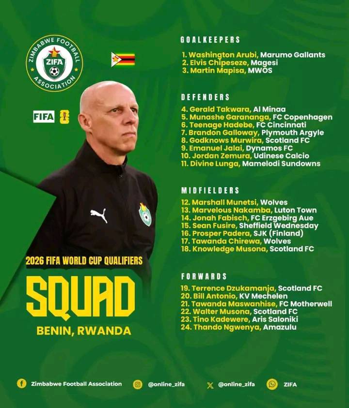 Le sélectionneur du Zimbabwé Michale Nees a retenu une liste de 24 joueurs pour affronter le Bénin en septembre lors de la 7e journée des qualifications du Mondial USA-Canada-Mexique 2026. Sans grande surprise le capitaine Marshall Munetsi figure dans le groupe qui sera opposé aux Guépards le 5 septembre au stade d’Ebimpé en Côte d’ivoire. Le Bénin et le Zimbabawé avaient fait match nul 2-2 à Durban en mars dernier lors de la 5e journée.